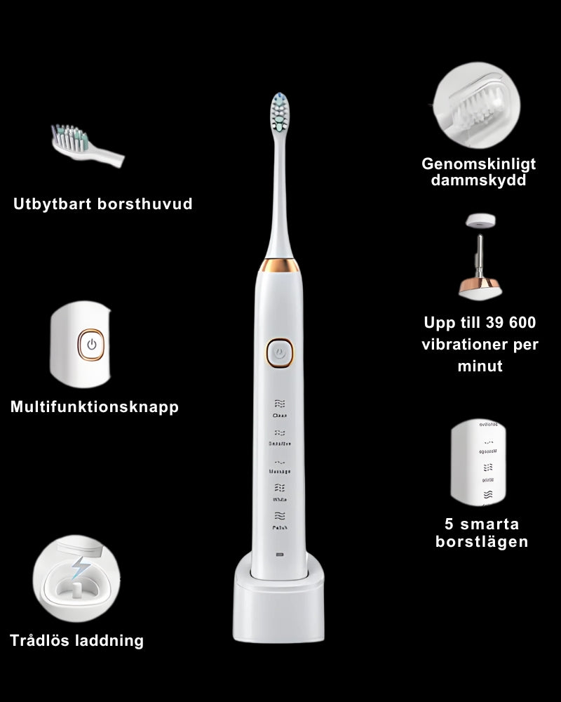 Eltandborste med upp till 39 600 vibrationer per minut för effektiv och skonsam rengöring. Utrustad med 5 borstlägen, mjuka borstar, vattentät design och lång batteritid – för bättre munhygien varje dag.